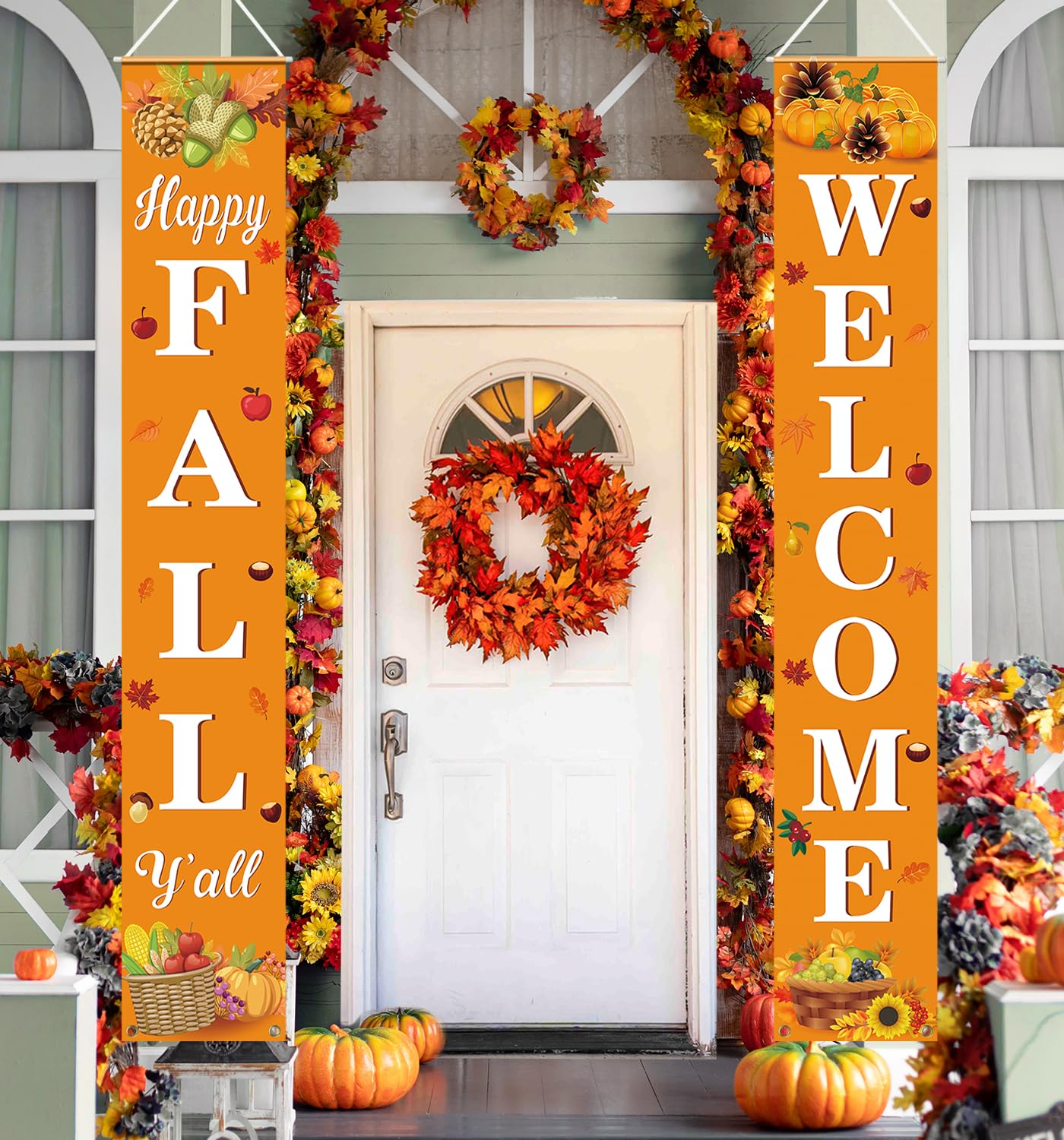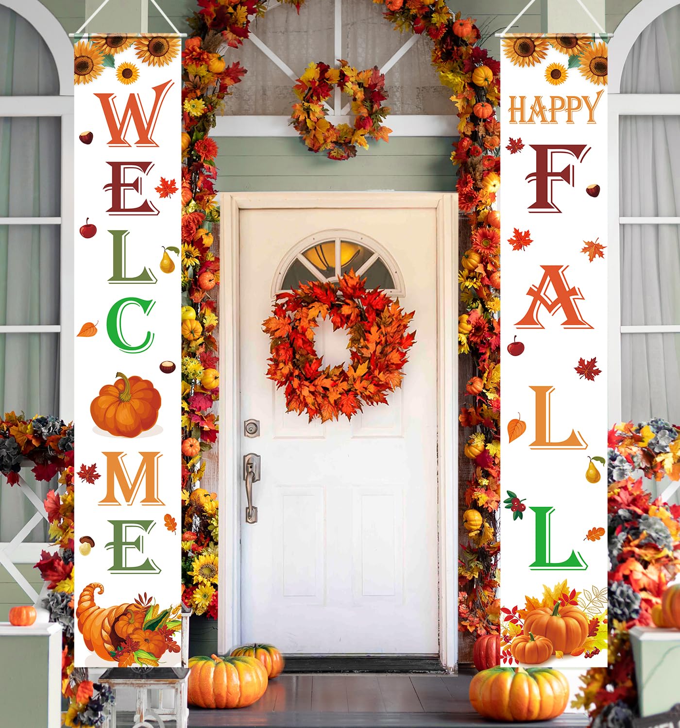 If you want a quick way to brighten your porch or front door, this banner works well. It has a clean design saying “WELCOME & HAPPY FALL,” which fits the autumn mood without being too much.