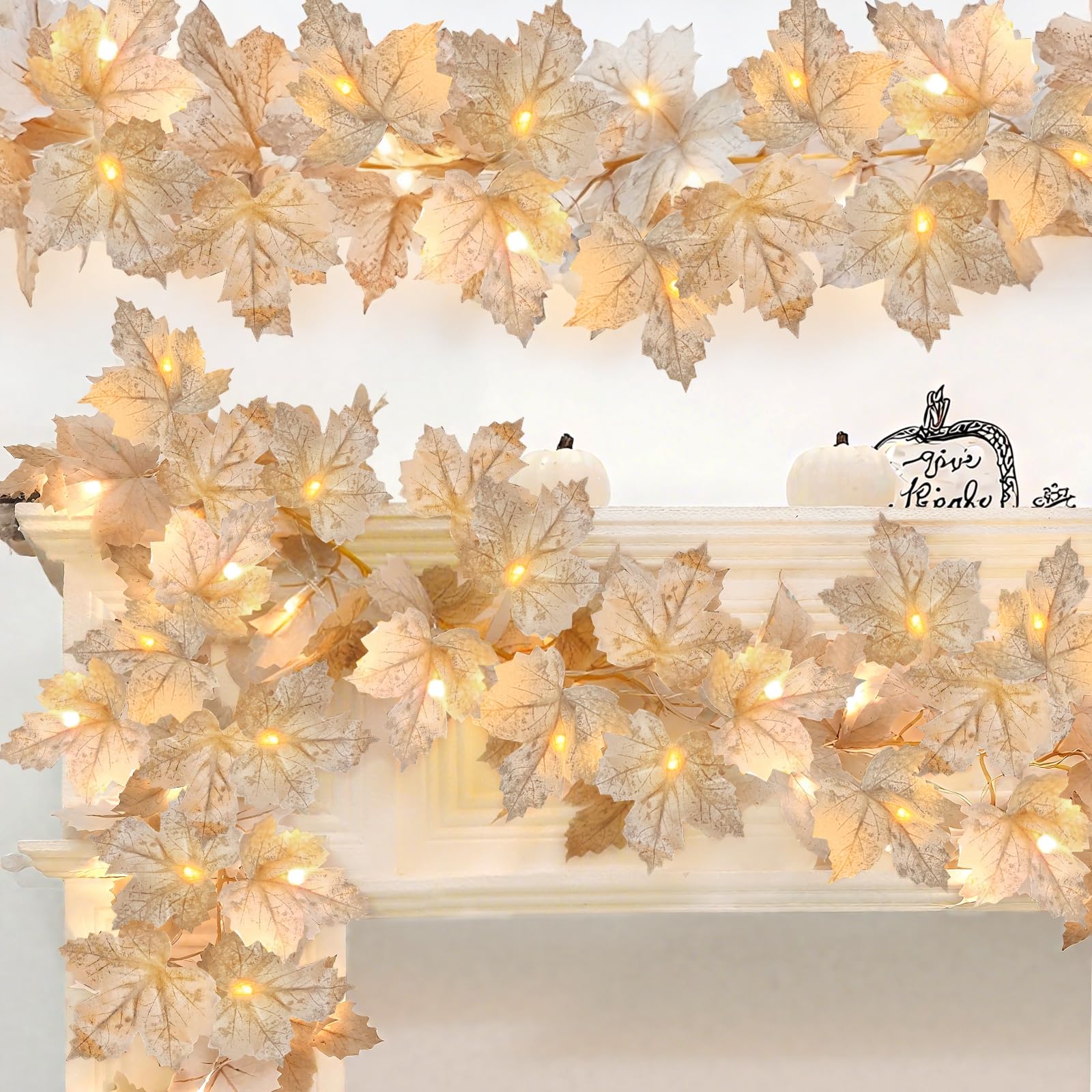 This set includes three 8.2-foot strands with double maple leaves on each light. During the day, the garlands look like real fall leaves. When lit, they add a soft glow that makes your home feel warm and welcoming.
