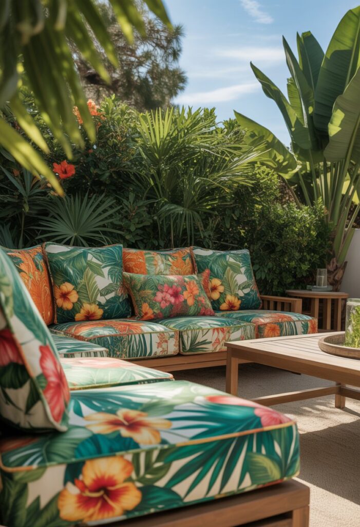 You can easily add a tropical vibe to your backyard using pillows and cushions with tropical prints. Look for bright palm leaves or floral patterns to brighten your seating areas.