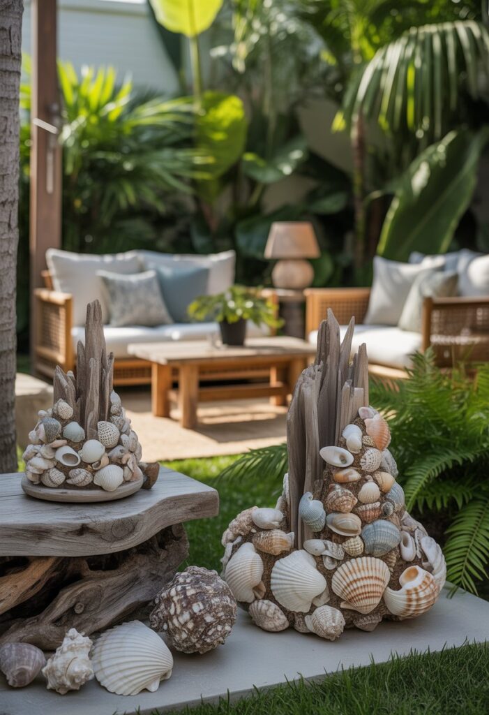 Try creating simple decorations like shell-covered planters or driftwood sculptures. They look great among plants or on tables.
