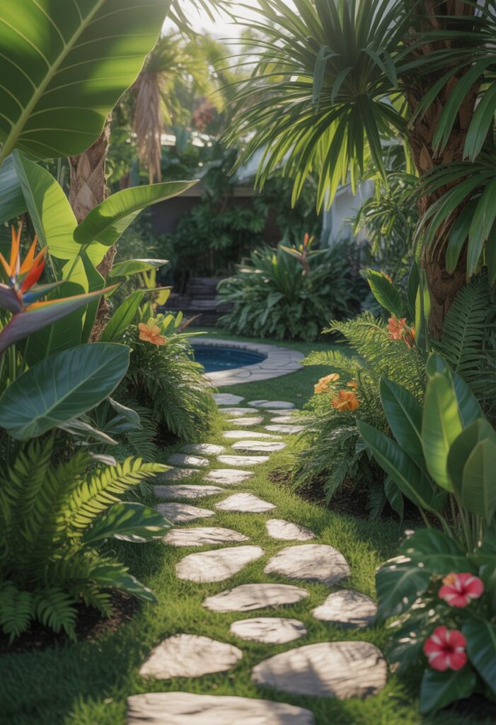 Line the edges with tropical plants such as palms, ferns, or colorful flowers. This will create a lush, inviting walk that feels calm and refreshing. It also helps guide visitors through your garden space.