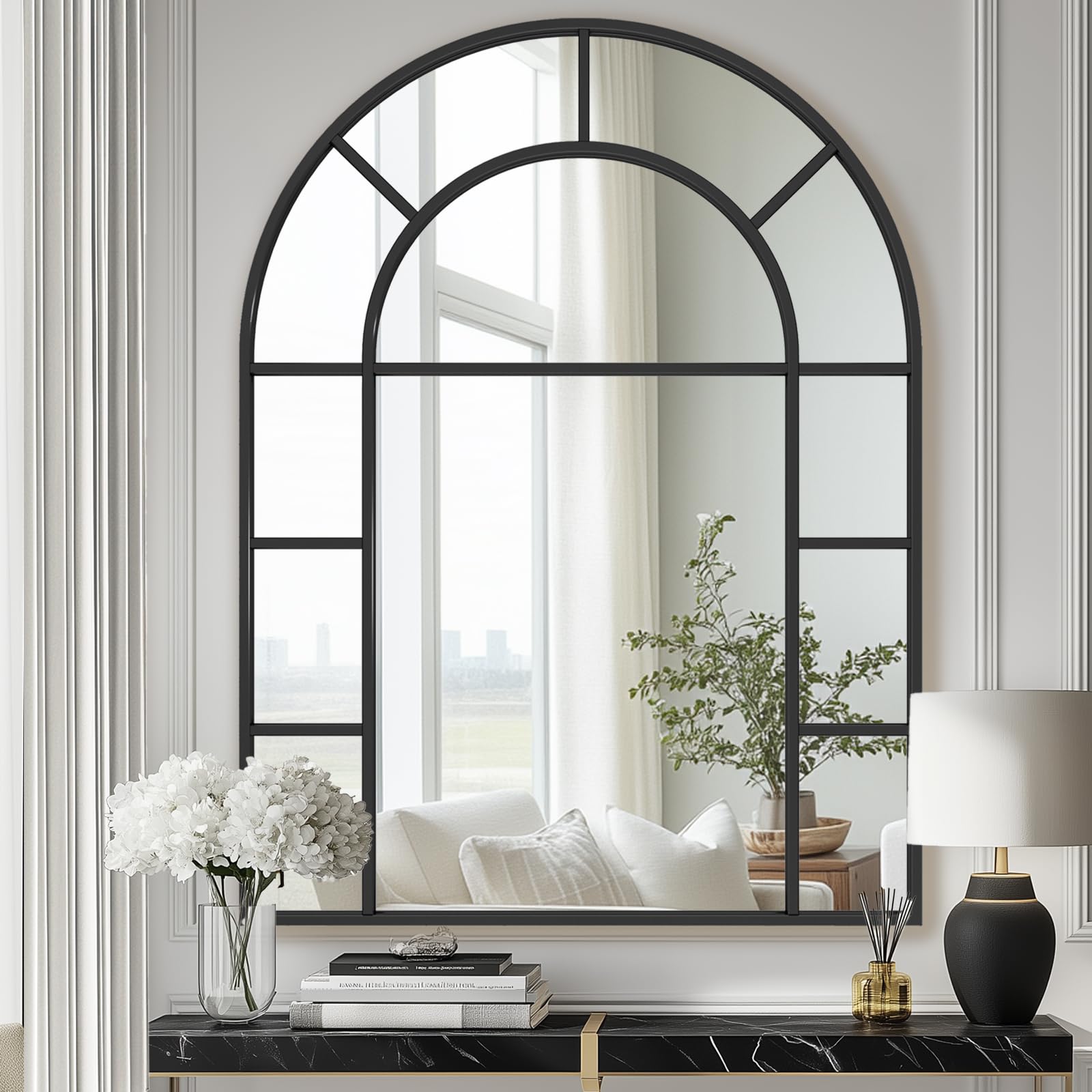You will like how this arched wall mirror looks like a real window. Its divided panes create a comfy, old-fashioned feel that fits well in many rooms.
