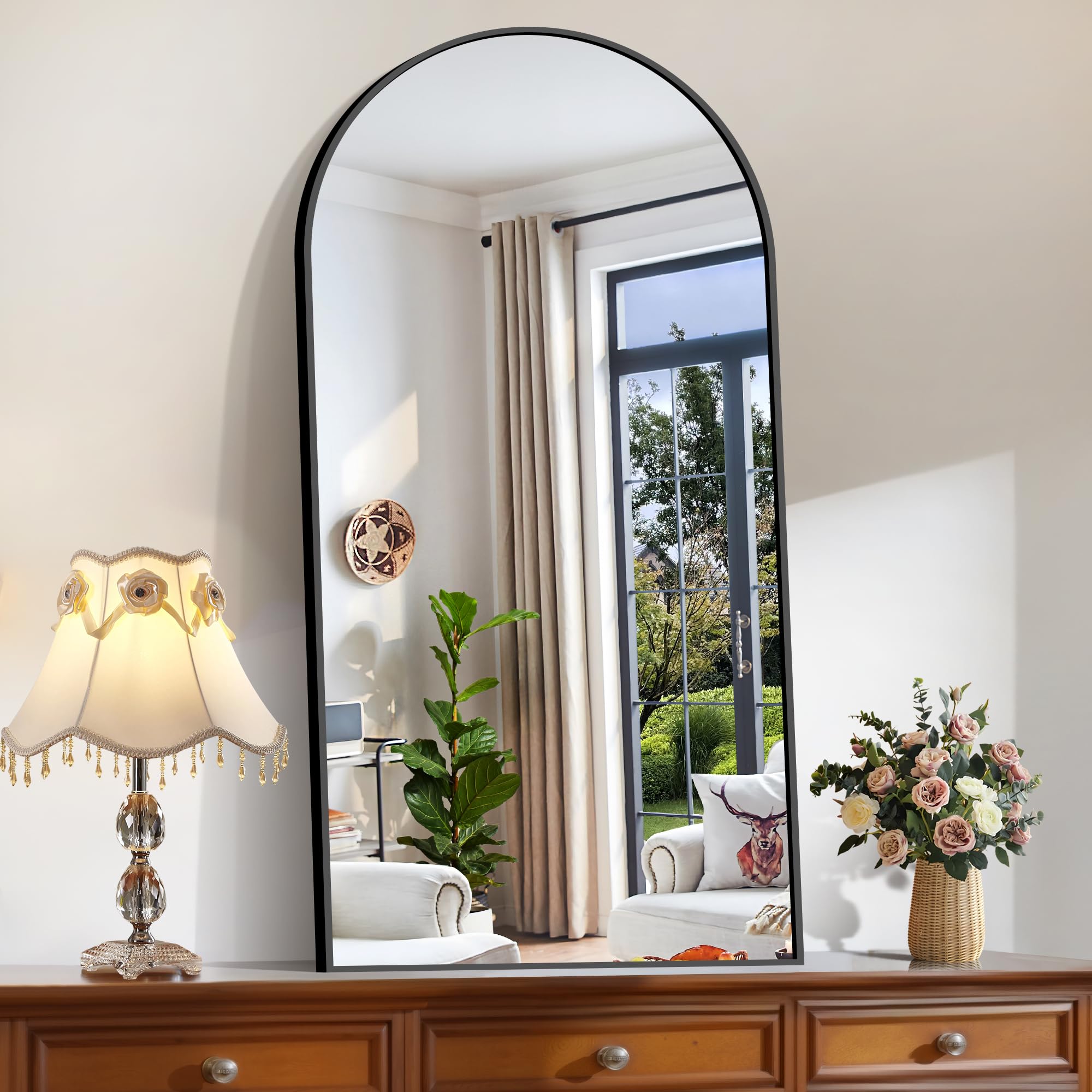 You get a tall mirror that works in bedrooms, bathrooms, or hallways. Its arched shape adds a nice design touch without being too fancy. The black aluminum frame resists damage and moisture better than wood.