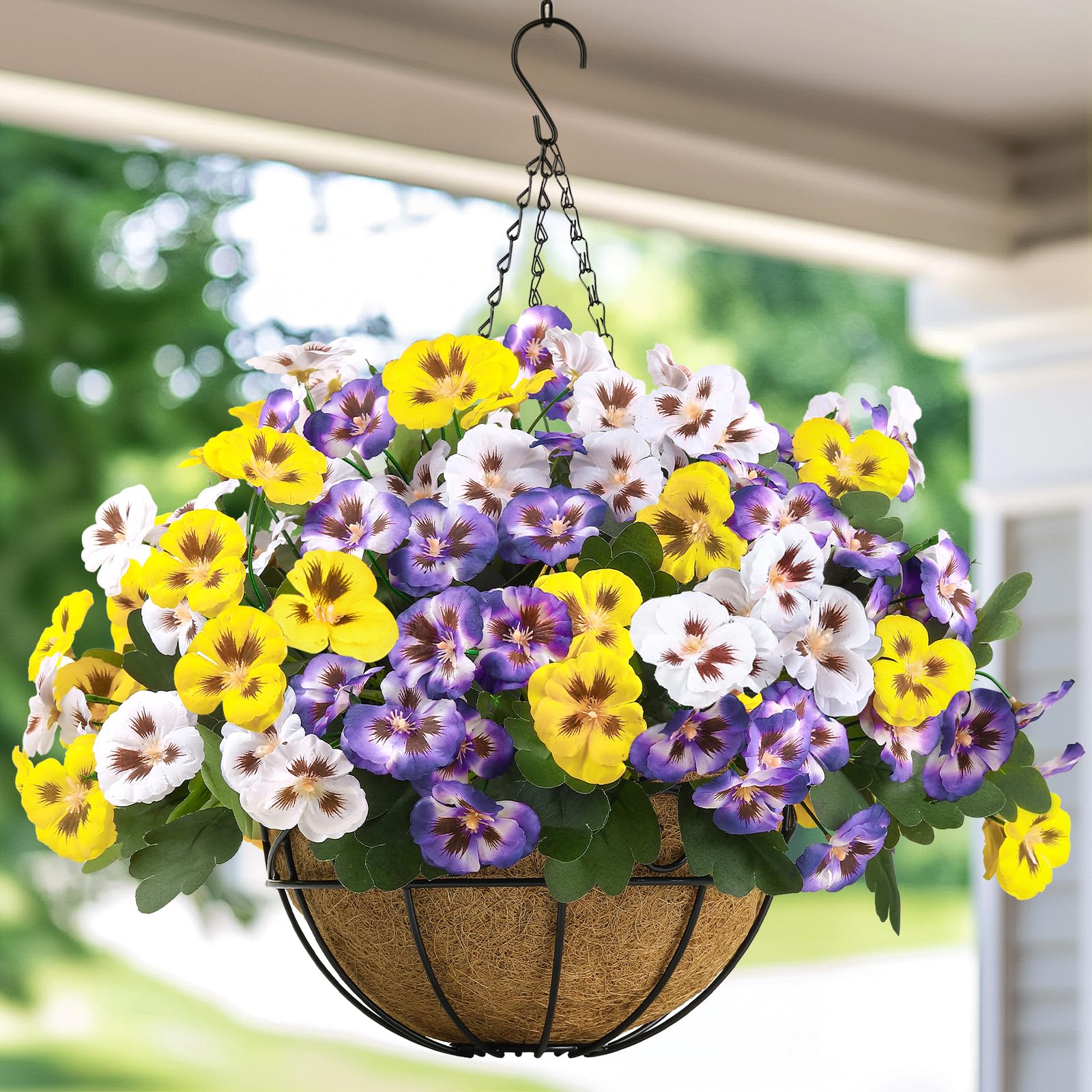 This hanging basket comes with 12 artificial pansies in purple, yellow, and white. You get everything to assemble it quickly, just pop the foam into the basket and stick the flowers where you want.