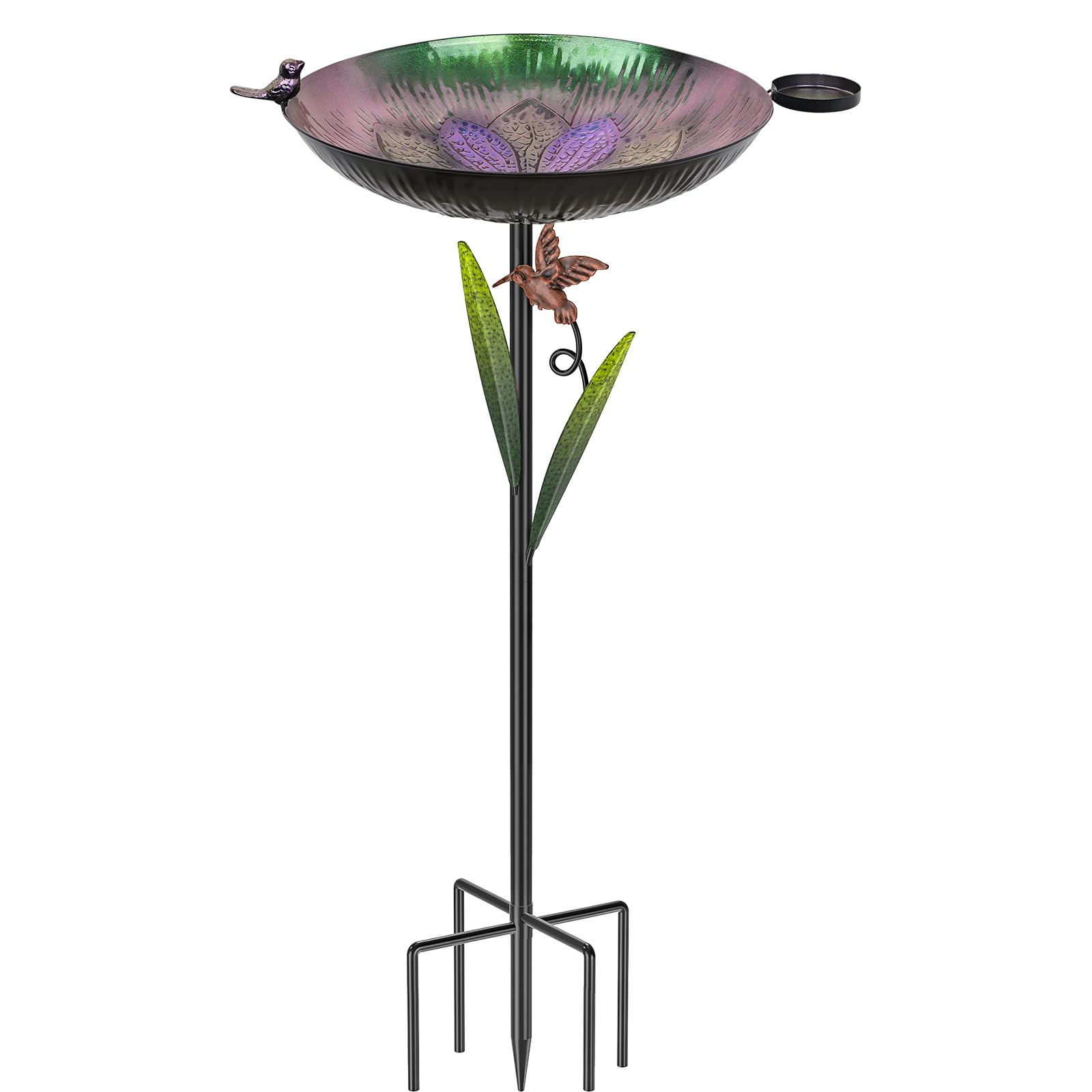 You’ll like how this bird bath looks in your yard. The colorful glass bowl draws attention and fits well with flowers or plants around it.