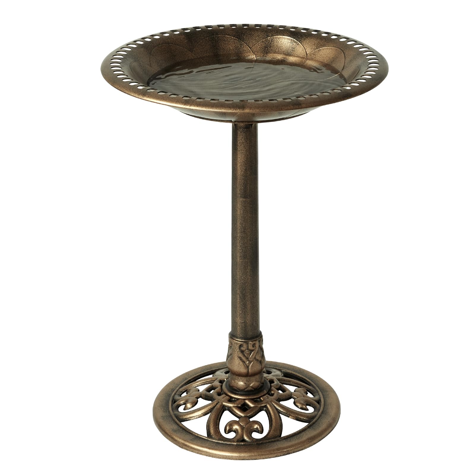 This bird bath has a nice royal look with a bronzed finish that fits well outside. It is light enough to carry but designed with stability in mind once you stake it down and fill the hollow base with gravel or stones.