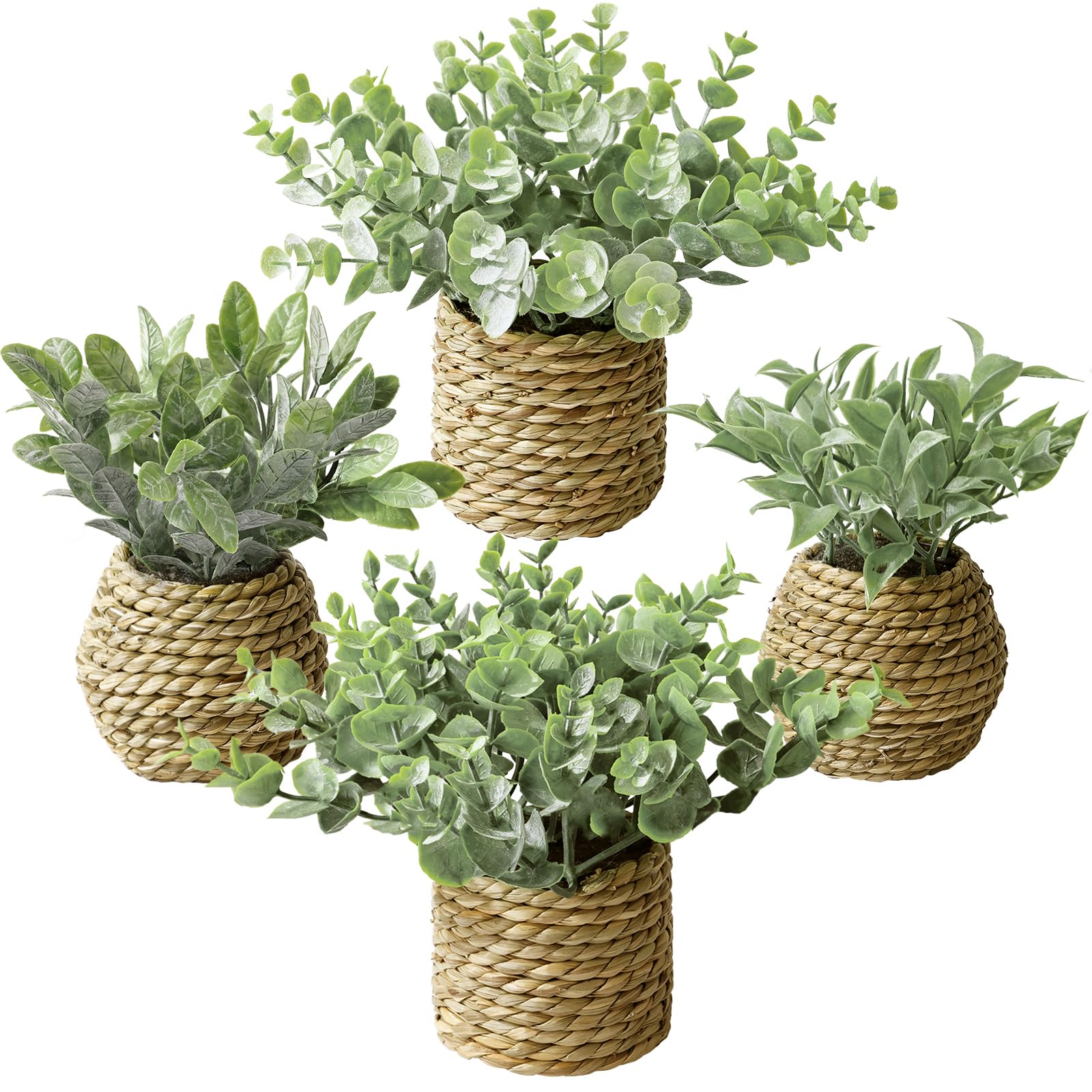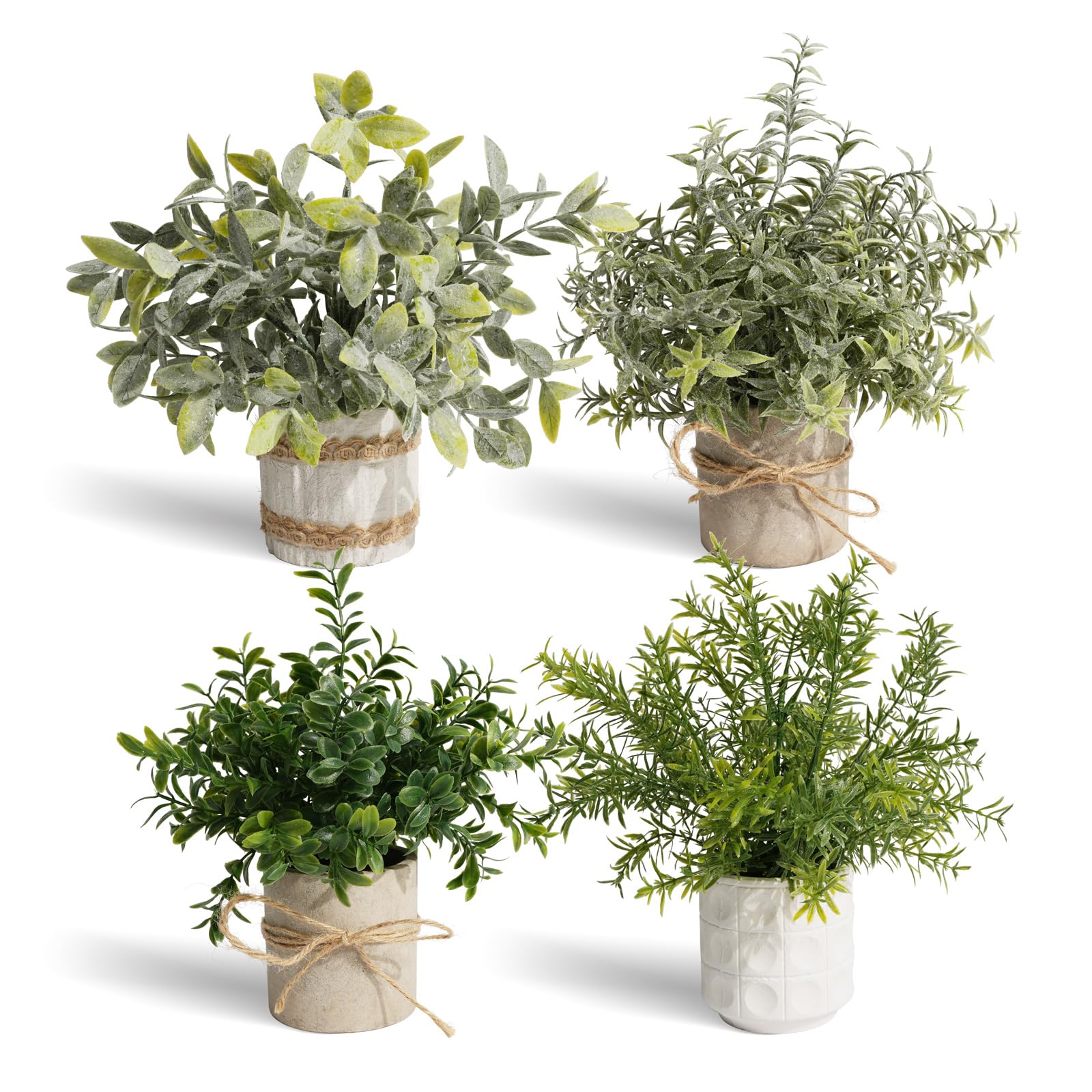 These artificial plants come in a set of four, perfect for brightening up your kitchen, bathroom, or office. The leaves have a mix of bright green and frosty tones, giving them a nice farmhouse style that can suit many rooms.