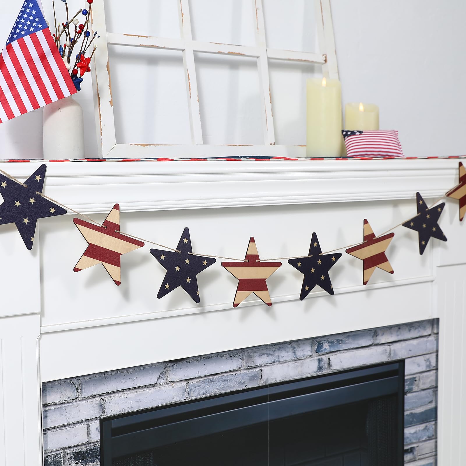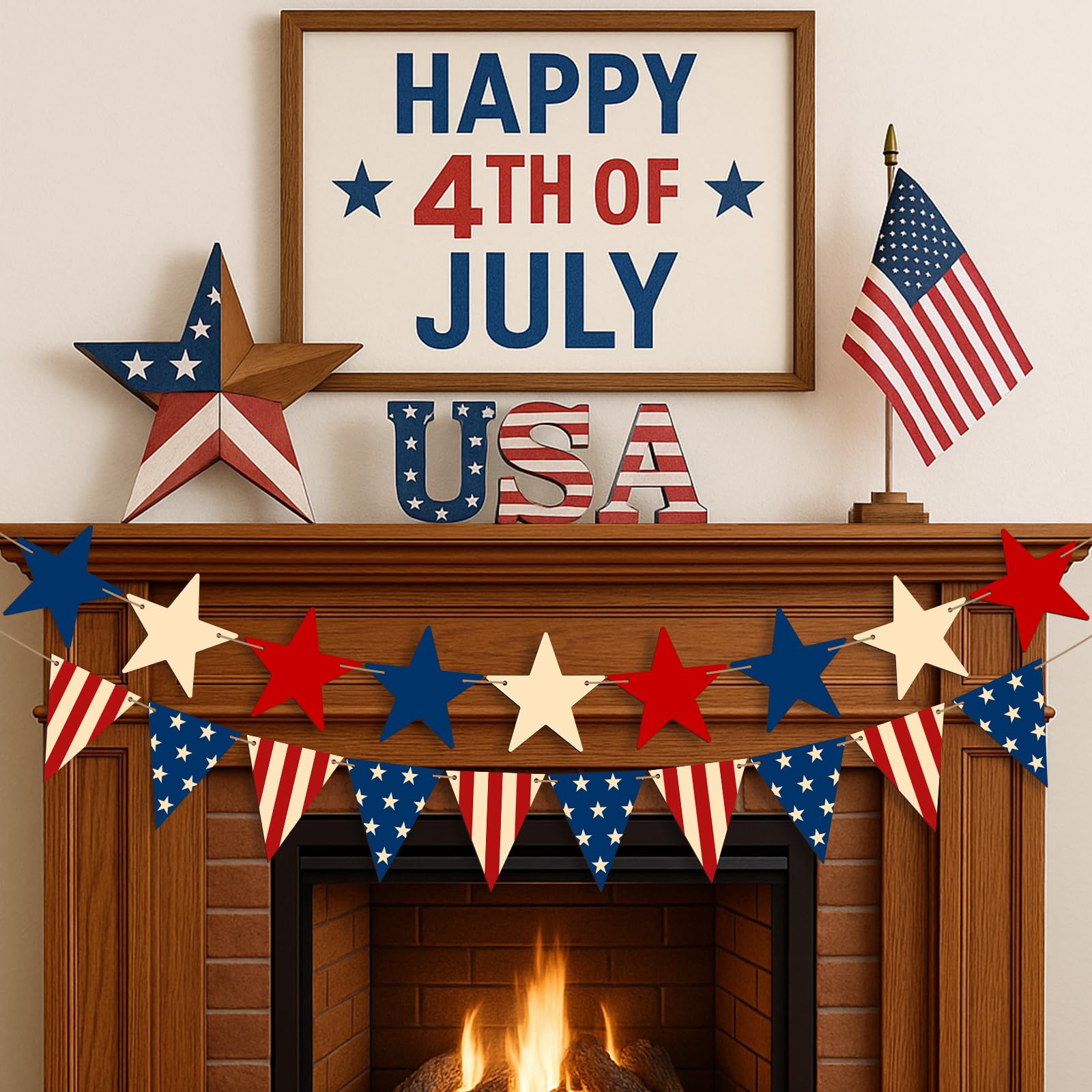 You don’t need to fuss with assembling this garland because it arrives ready to use. The wooden stars and USA triangles use classic red, white, and blue colors that stand out without fading. This set brings a warm, vintage touch that’s perfect for your mantel, wall, or party table.