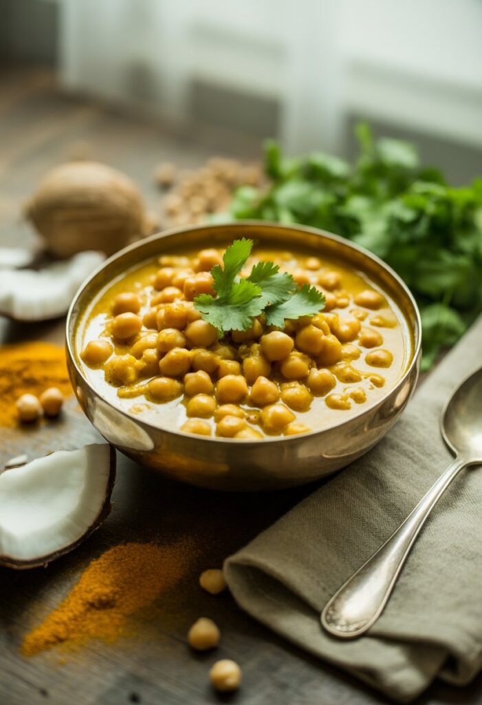 Start by cooking onion, garlic, and ginger in a bit of oil until soft. Add canned chickpeas, coconut milk, and mild curry powder, then let everything simmer until thick.