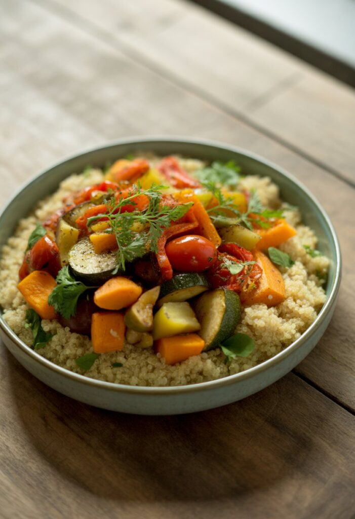 You can make a warm, satisfying meal with simple ingredients like quinoa, mixed vegetables, and chickpeas. The dish is colorful, filling, and full of natural flavor.