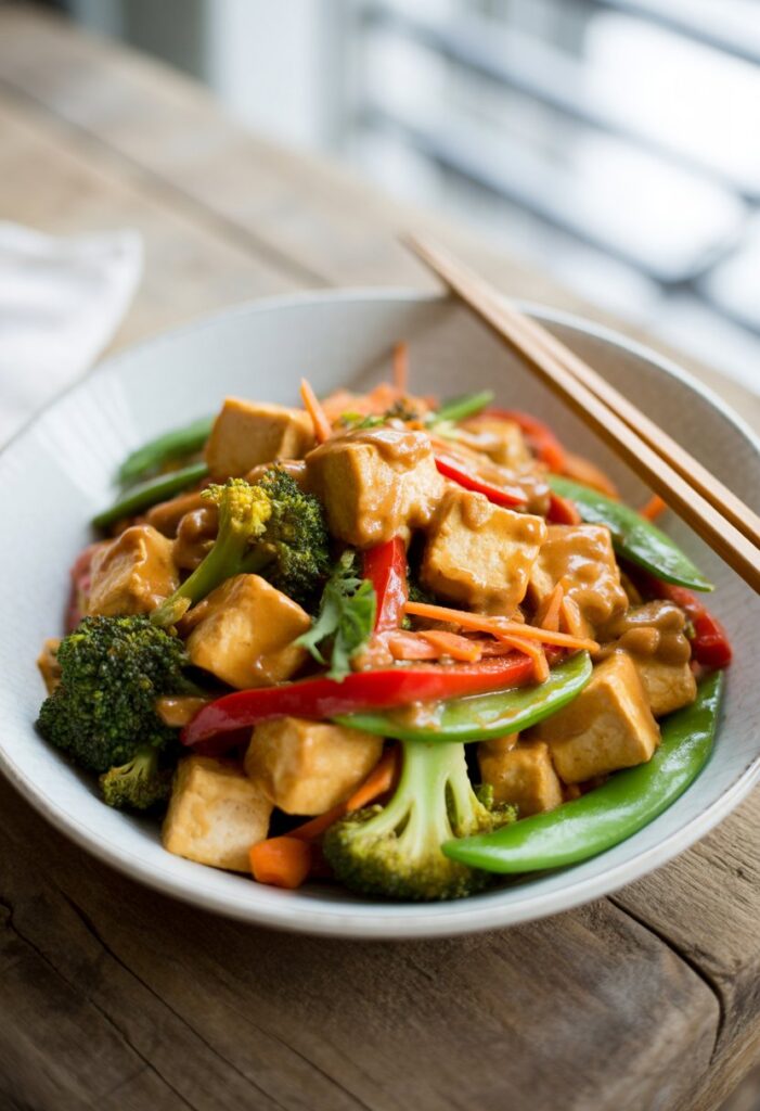 Whisk together a sauce with peanut butter, soy sauce, garlic, and a touch of lime juice. Pour it over the tofu and veggies, then stir until everything is coated.