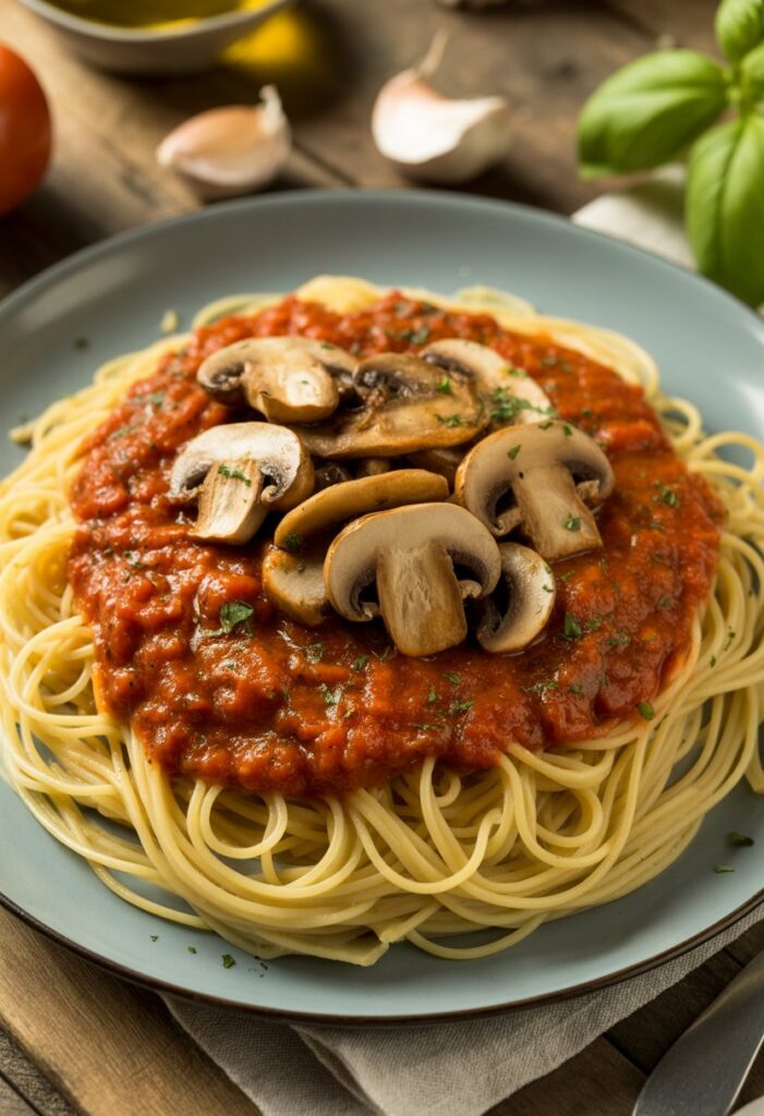 You can make a satisfying meal with simple pantry items and fresh mushrooms. Cook spaghetti until tender, then toss it with a quick homemade marinara sauce made from canned tomatoes, garlic, and a bit of olive oil.