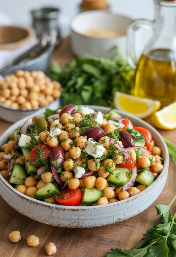 You can put together this fresh salad in about 10 minutes, making it an easy choice for busy days. The ingredients are simple and affordable—chickpeas, chopped cucumbers, tomatoes, red onion, and a drizzle of olive oil and lemon juice.