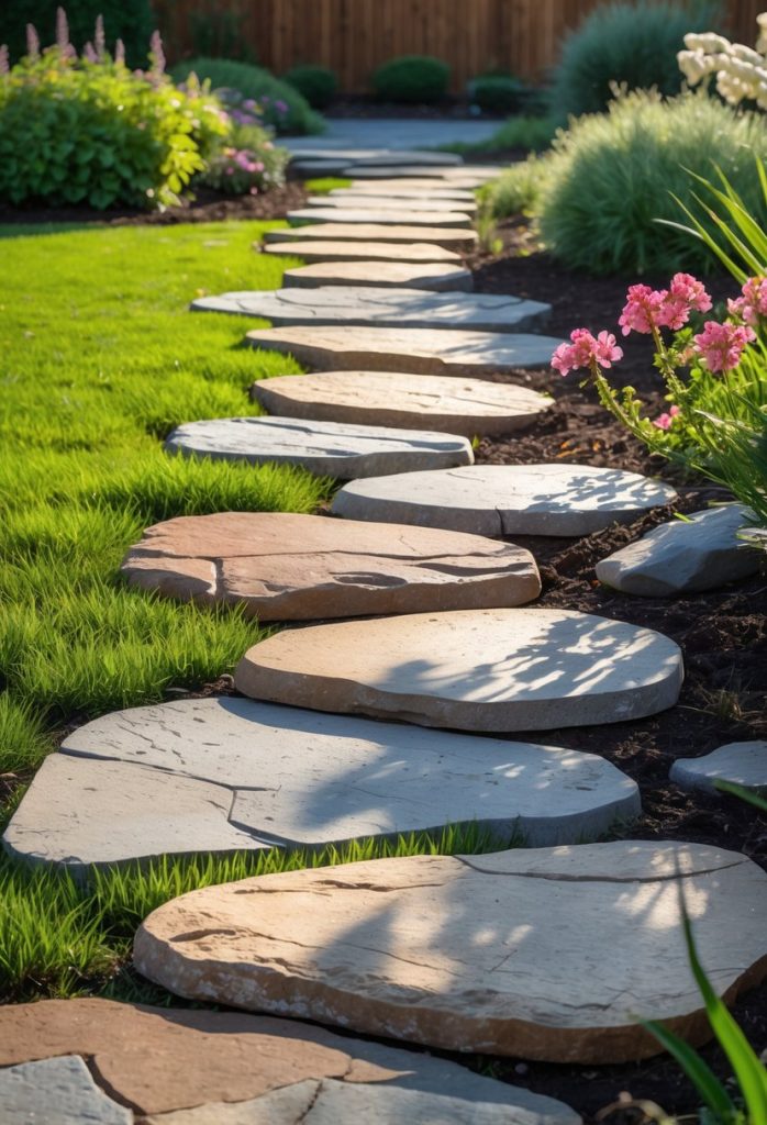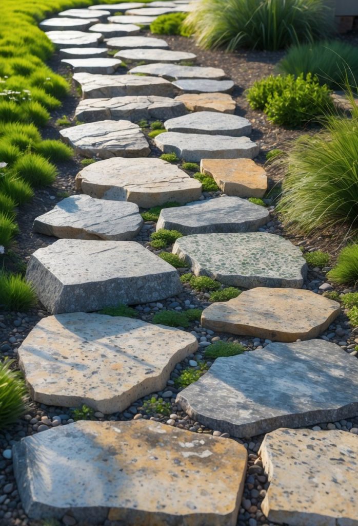 Flagstone stepping stones give your walkway a natural, charming look. You can place stones with space between them and fill gaps with gravel or grass. This keeps costs down and adds texture to your path. Flagstone is durable and fits many garden styles.