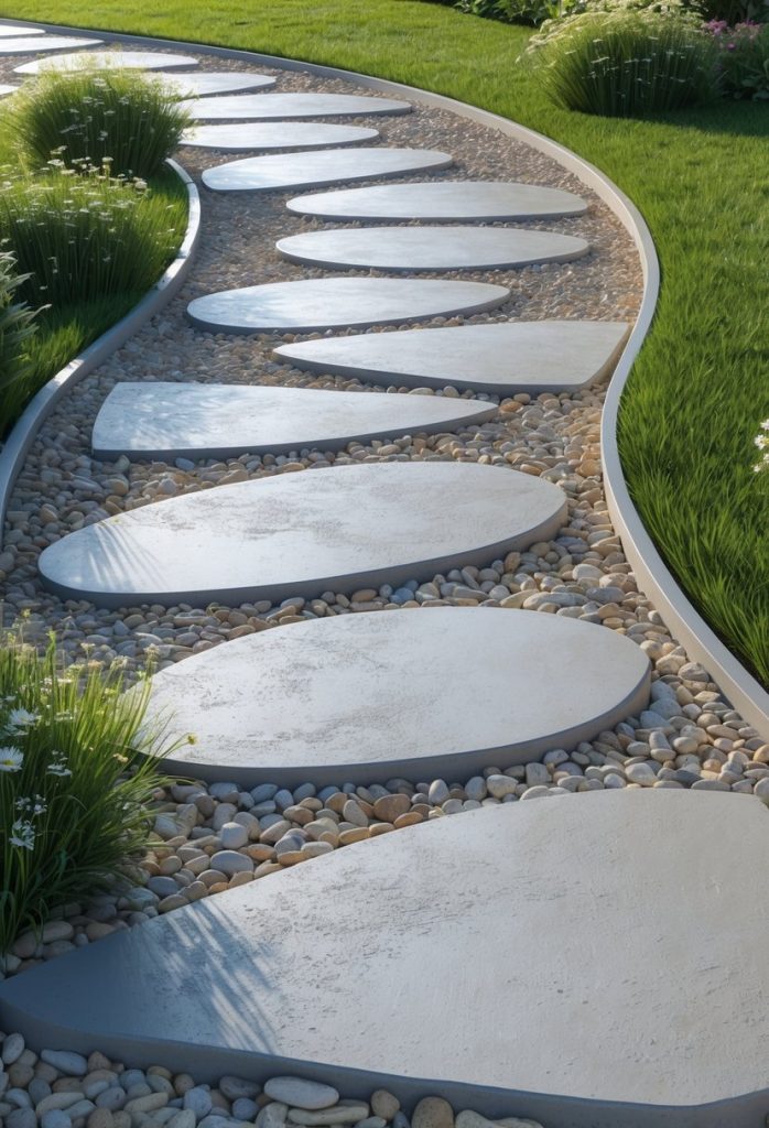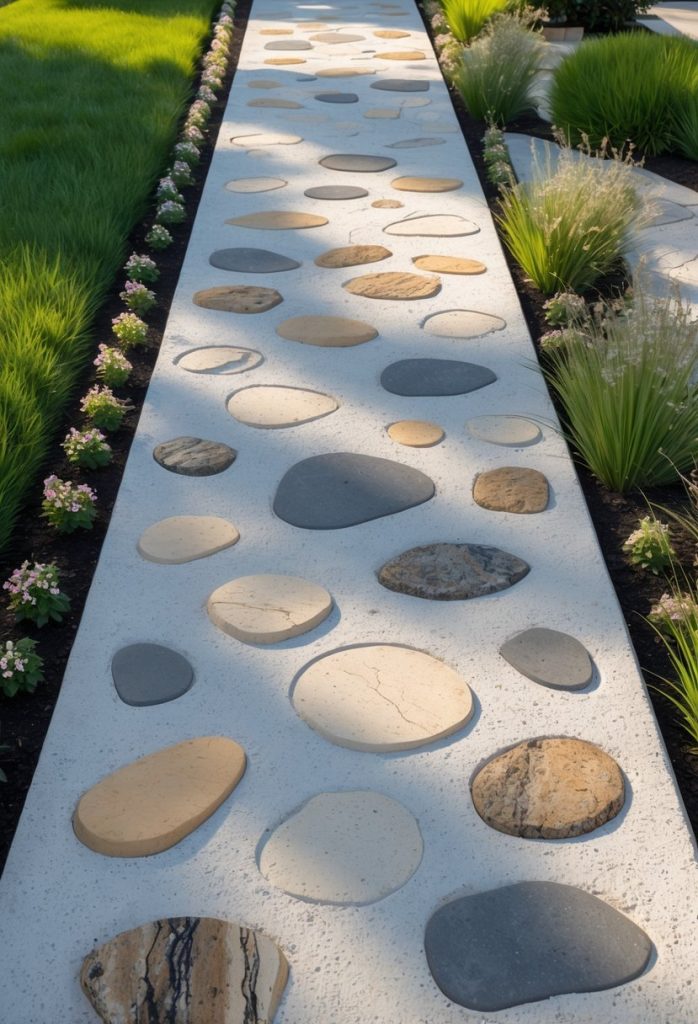 You can create a simple concrete walkway and press small stones into the surface while it’s still wet. This adds texture and a touch of nature to your path. It’s an easy way to make a basic concrete path more interesting without spending much.