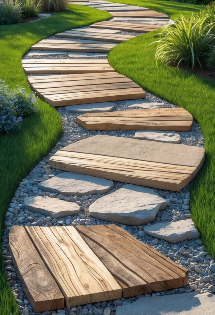 You can create a simple path using wood and stone for a natural look. Place wooden planks or rounds with stones filling the gaps.