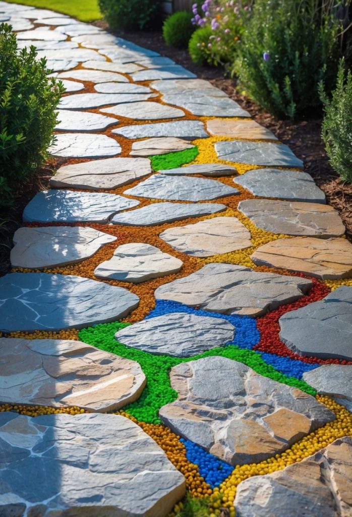 You can brighten your flagstone walkway by using colorful grout between the stones. This adds a fun pop of color that makes your path stand out.