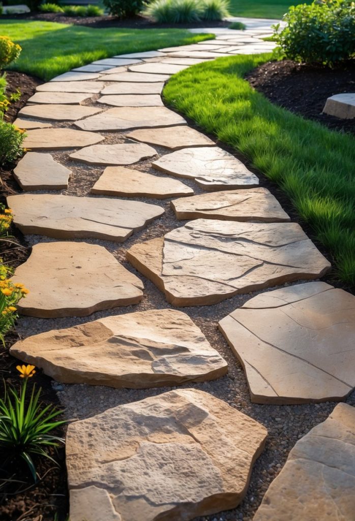 A sandstone flagstone path adds a warm, natural look to your yard. The stones come in soft colors like tan, red, and brown, which blend well with plants and soil.