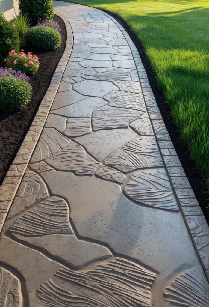 You can create a stylish walkway with stamped concrete. It looks like wood, stone, or tile but costs less.
