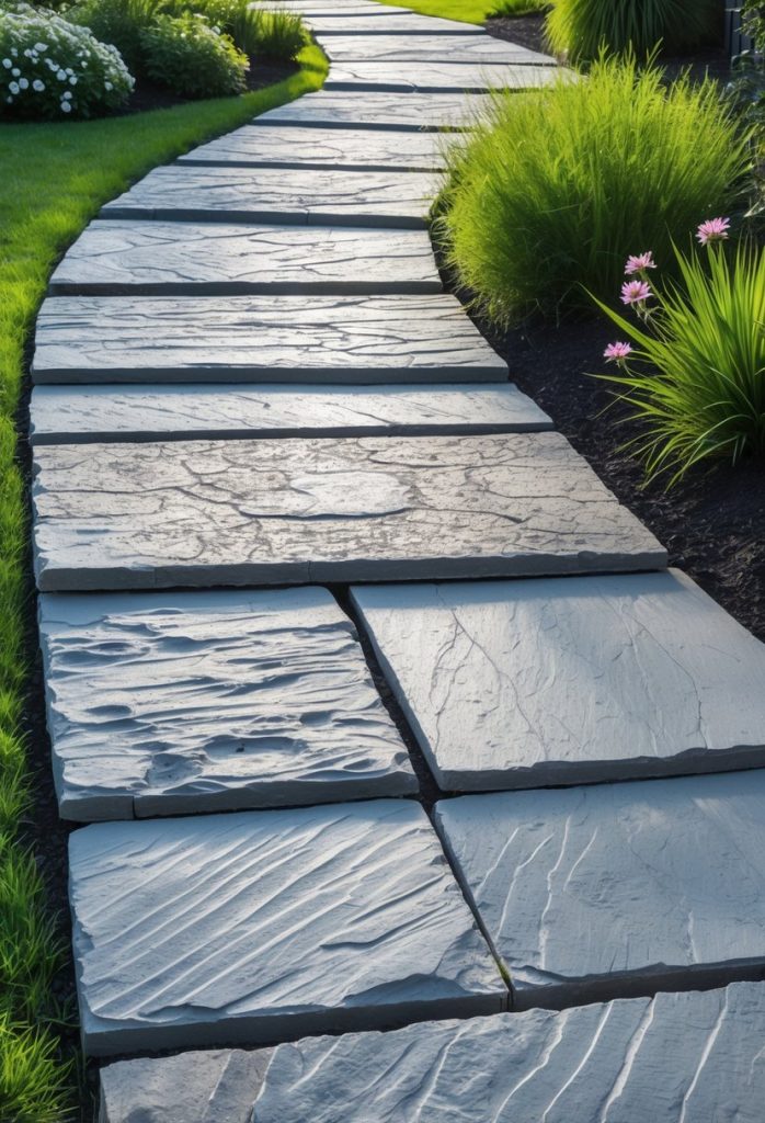 You can create a concrete slate path by using molds to shape concrete into flat stones. This option is affordable and lets you control the look of your walkway.