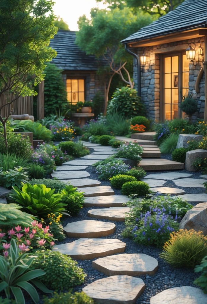 You can add charm to your garden by making winding pathways with natural stone slabs. These stones bring a cozy, rustic feel that fits well in small spaces. A curved path also makes your garden feel more inviting and interesting to walk through.