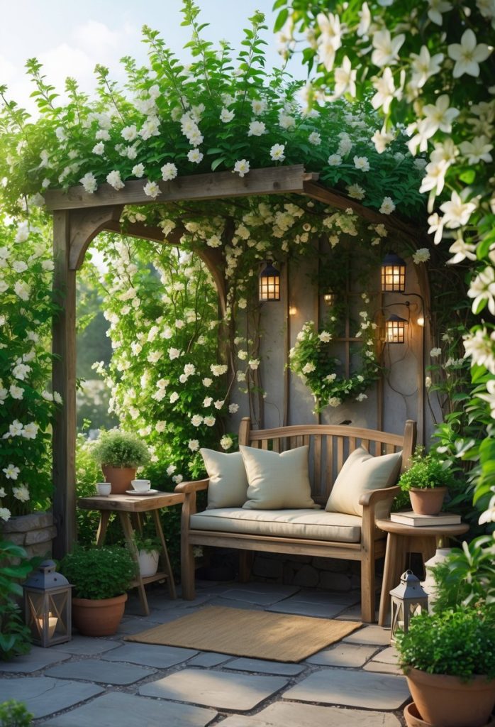 Jasmine works well in small gardens because it can grow up trellises or walls, saving space. The scent will gently surround your seating area, creating a cozy and inviting spot.