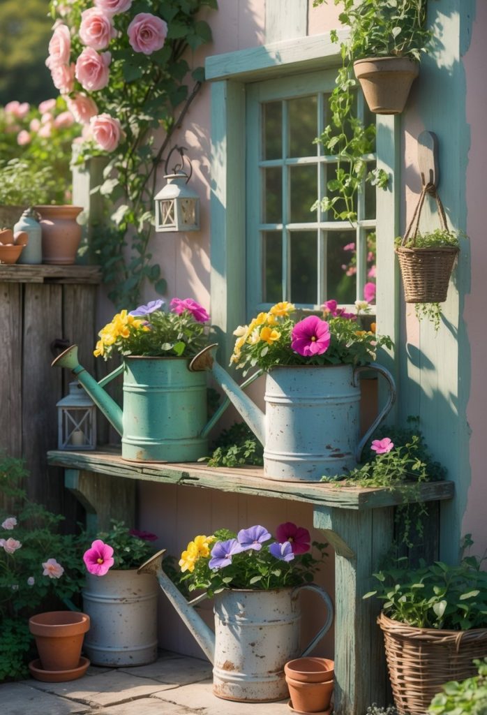 You can use old watering cans as unique flower planters. Just plant small flowers or succulents inside.