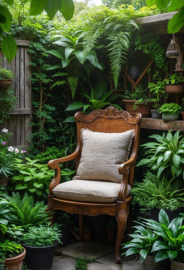 You can create a cozy spot by placing a vintage chair in your garden. Surround it with leafy plants and colorful flowers for a peaceful feel. Adding soft cushions makes the space comfy for reading or resting.