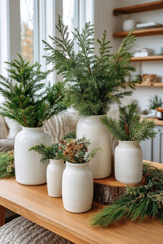 You can use evergreen branches in simple vases to add fresh greenery to your space. Place different height glasses or vases to keep the branches upright and looking neat.
