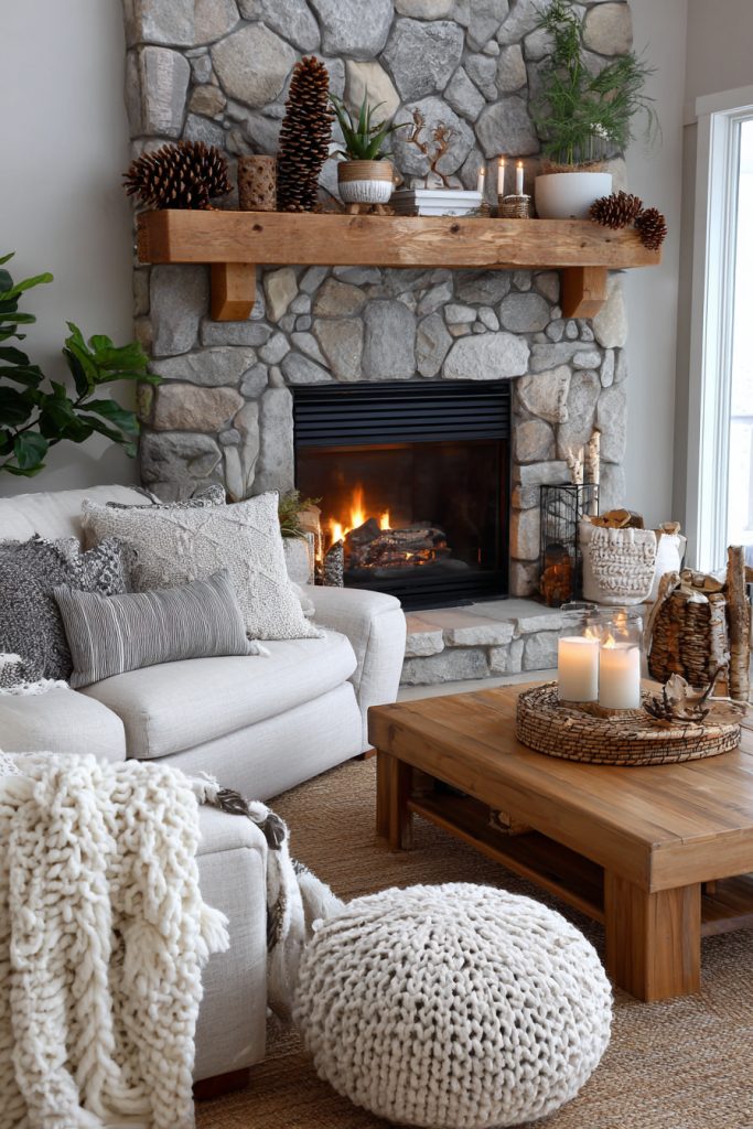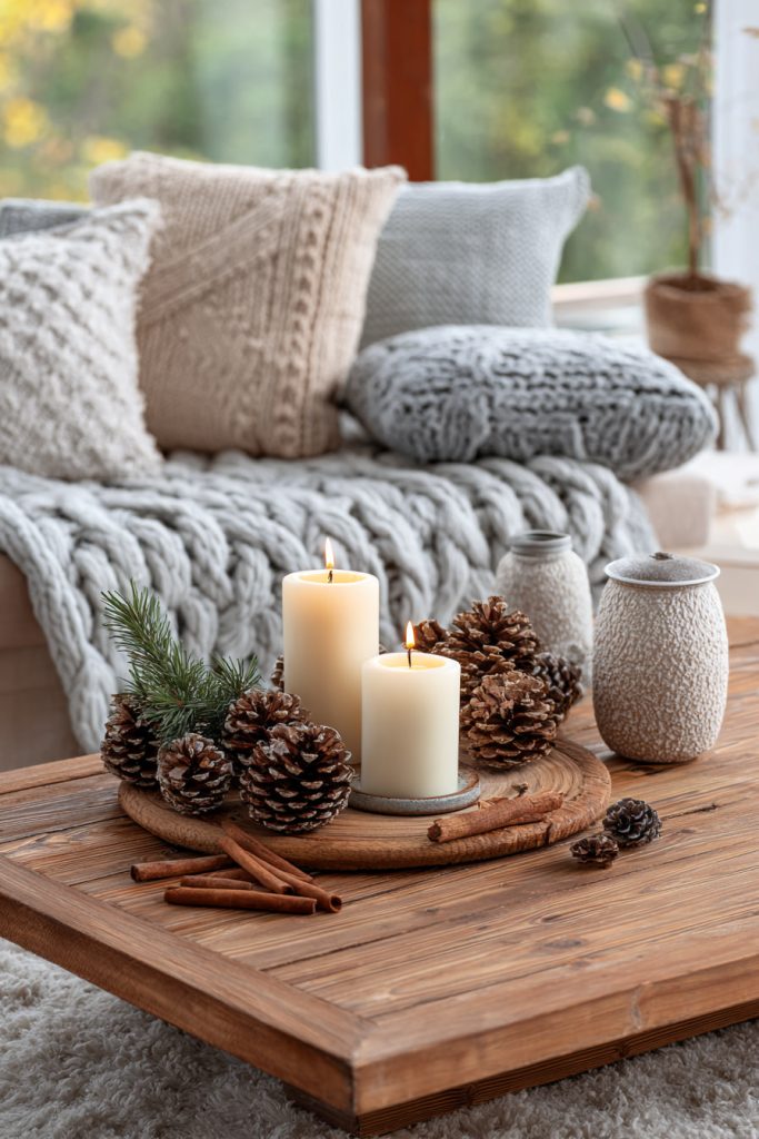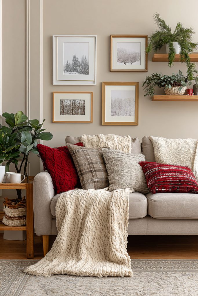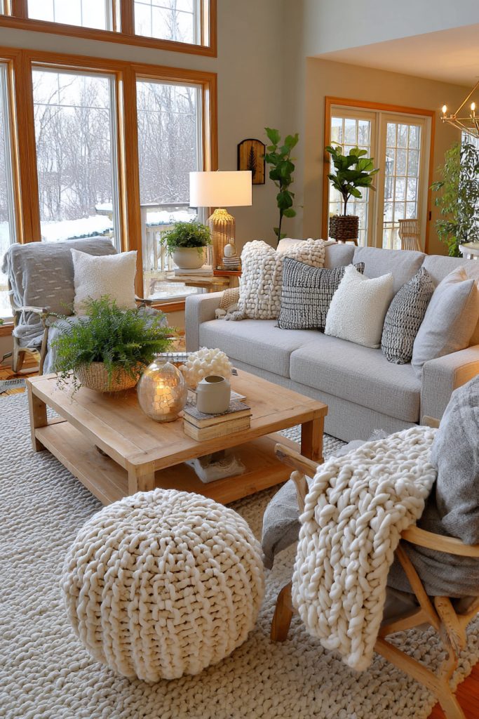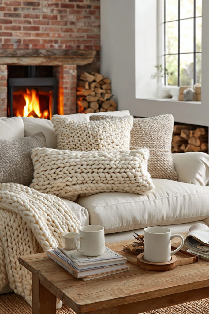 You can instantly add warmth by placing chunky knit pillows on your sofas and chairs. Their thick texture brings a cozy feel that’s perfect for winter.