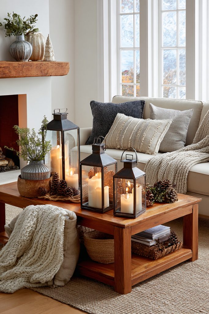 You can make a cozy vignette using lanterns, pinecones, and fairy lights. Place different-sized lanterns together and fill them with warm fairy lights.