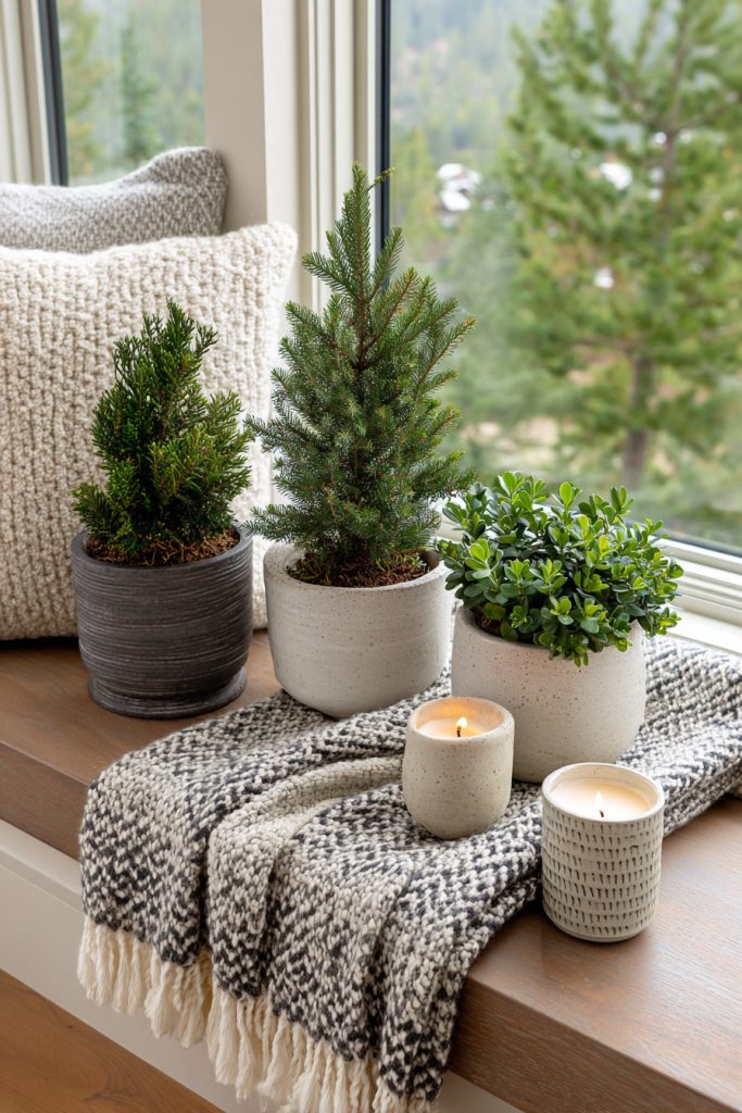 You can bring a fresh, natural touch to your home by adding small potted pine trees. They fit well in corners or near windows.