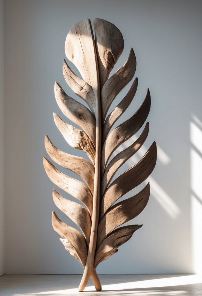 You can create a beautiful feather shape using pieces of driftwood. Arrange the wood in a way that mimics the soft curves and layers of a real feather.