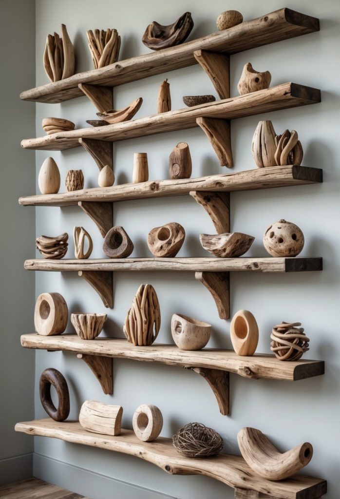 You can bring a natural, beachy feel to your space with rustic driftwood shelves. These shelves use weathered driftwood pieces to create simple, charming storage or display spots.