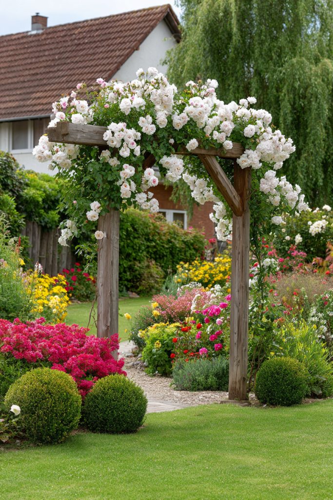 You can add charm to your front garden by growing climbing roses on a trellis. They bring color and fragrance while saving space.