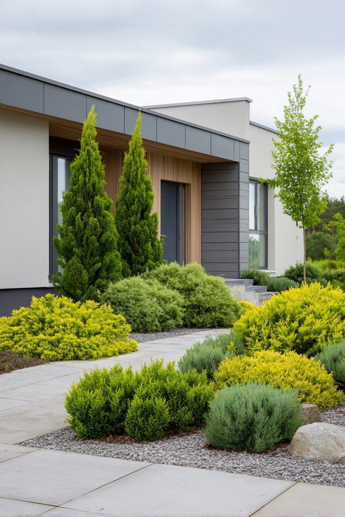 Try combining different types like boxwood, holly, and yew for variety in shape and size. This mix also gives your front yard a fresh look in every season with low maintenance.
