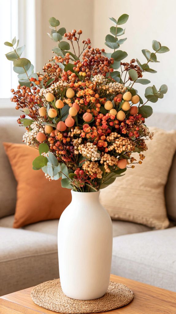You can create simple and beautiful fall arrangements using eucalyptus and berries. The soft green leaves of eucalyptus add a fresh look. Berries bring in pops of color that feel perfect for autumn.