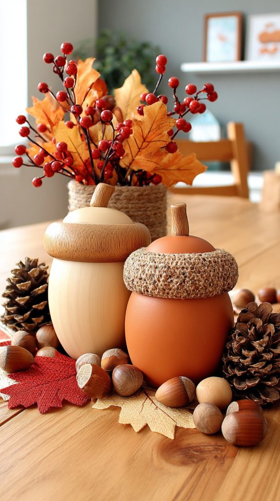 You can add a cozy fall touch to your table with acorn-shaped salt and pepper shakers. They fit well with autumn colors and bring a little nature inside.