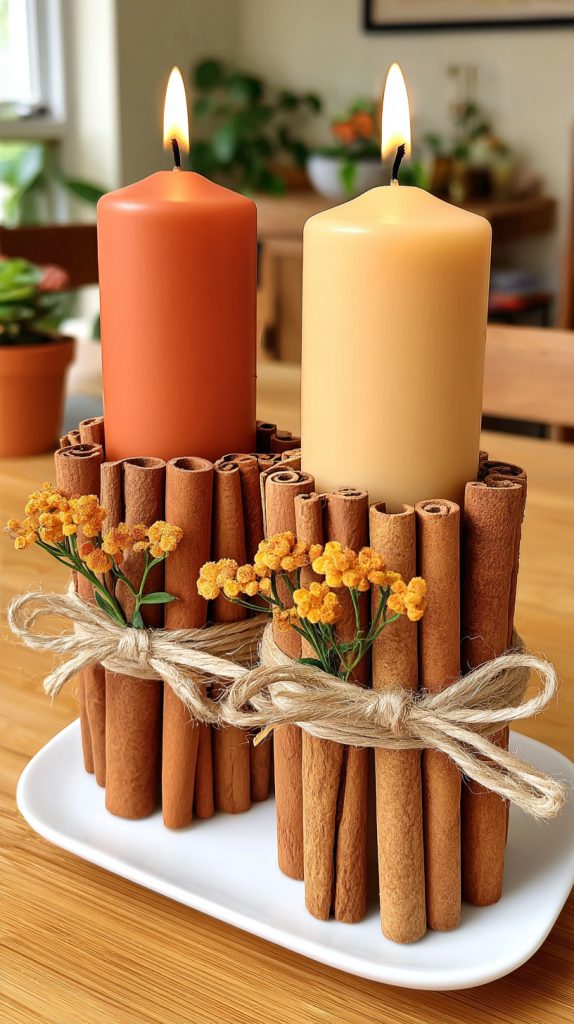 You can make cozy candle holders using cinnamon sticks. Simply wrap the sticks around a candle and tie them with twine or ribbon.