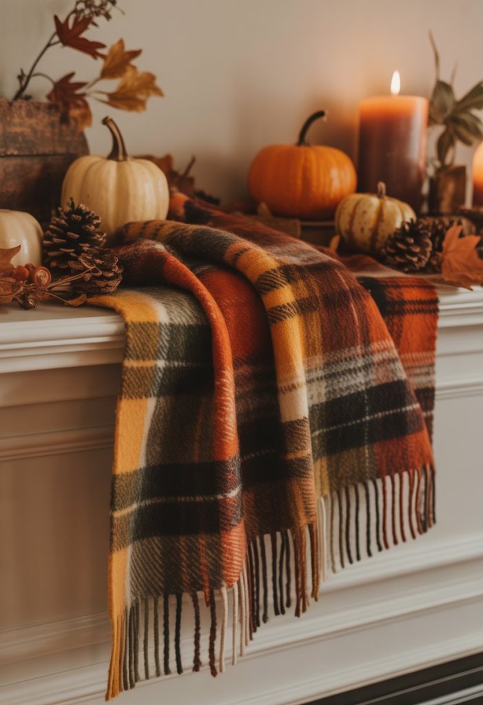 You can add warmth to your mantle by draping a plaid wool throw over it. This simple touch brings cozy textures and colors that fit the fall season.