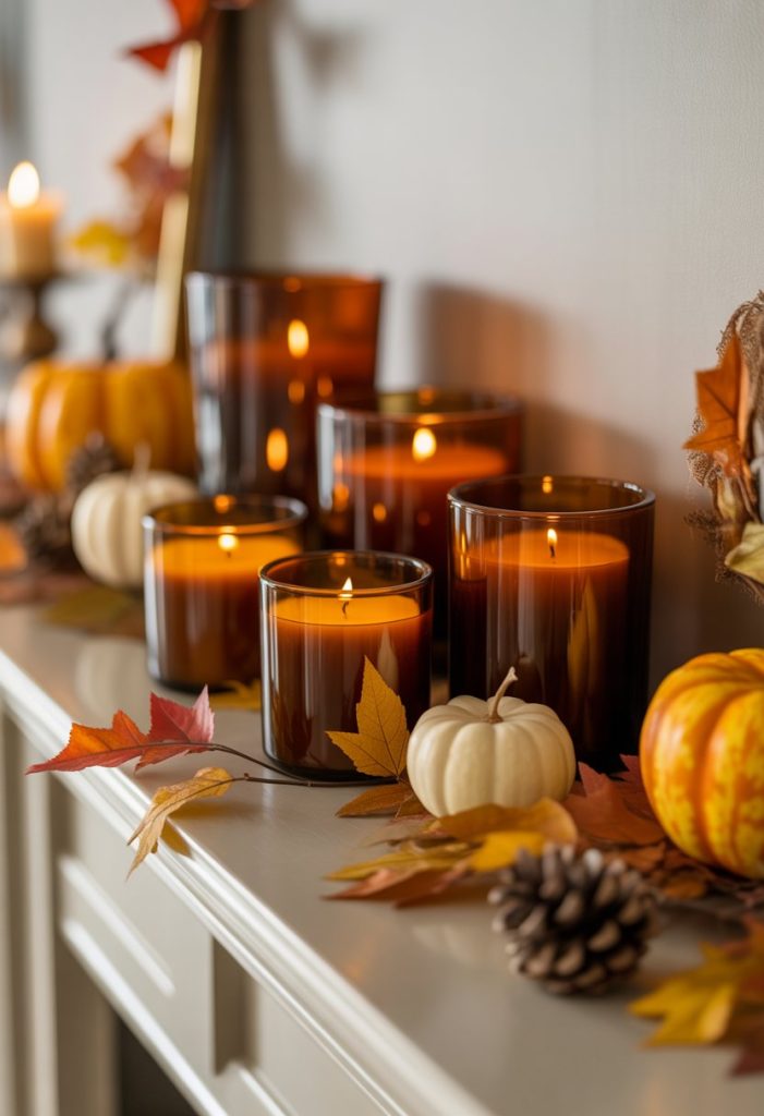 You can add warmth to your fall mantle using a set of amber glass candle holders. Their soft amber color brings a cozy glow that fits perfectly with autumn decor.