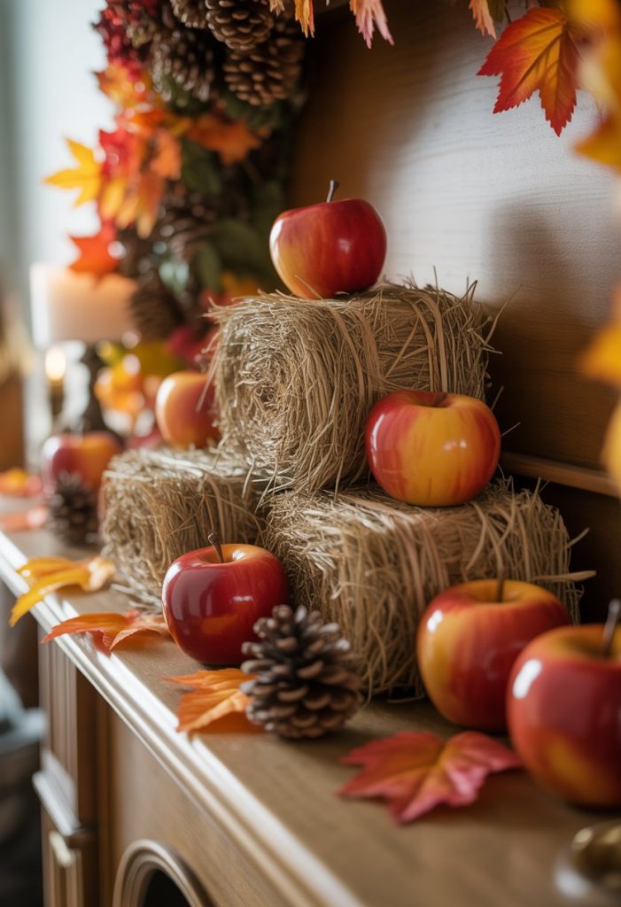 You can use mini hay bales to add a rustic look to your fall mantle. Place a few small hay bales side by side to create a base.