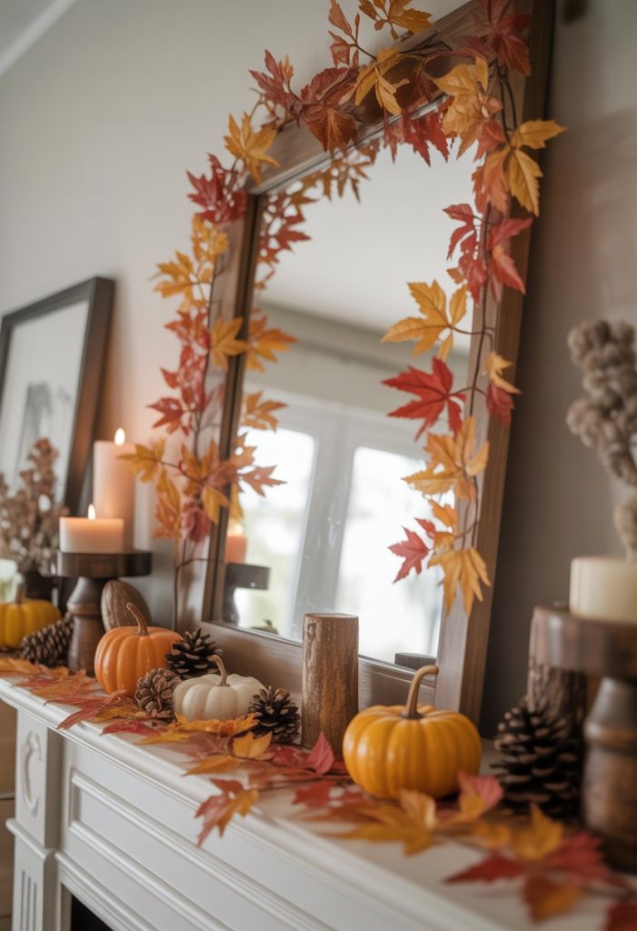 You can place a mirror above your mantel to open up the space and reflect light. Add autumn leaf accents around the frame to bring in warm fall colors.