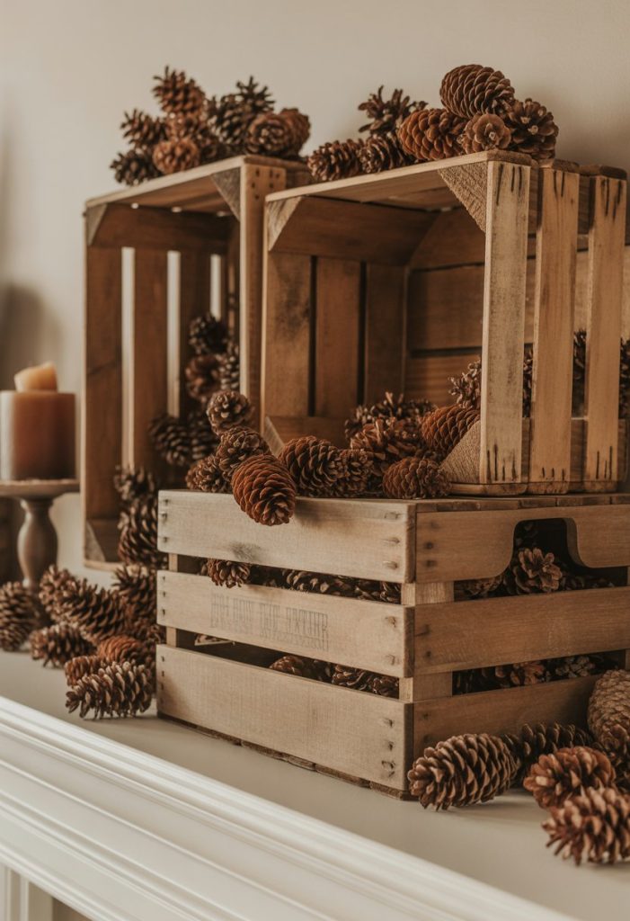 You can use vintage wooden crates to add a warm, rustic touch to your mantle. Fill them with pinecones for a simple, natural look.
