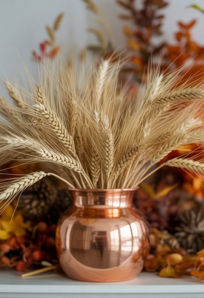 You can add a warm glow to your mantle with a copper vase. Fill it with wheat stalks for a simple and natural touch.