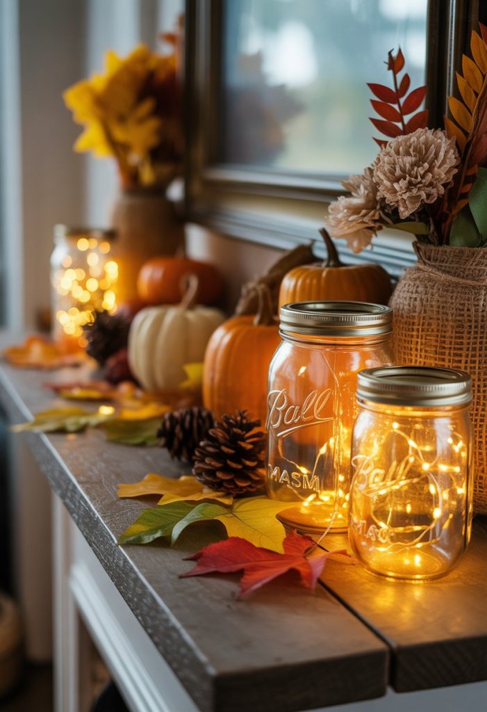 You can create a cozy look by filling mason jars with twinkle fairy lights. Place them on your mantle for a soft, warm glow that fits fall perfectly.