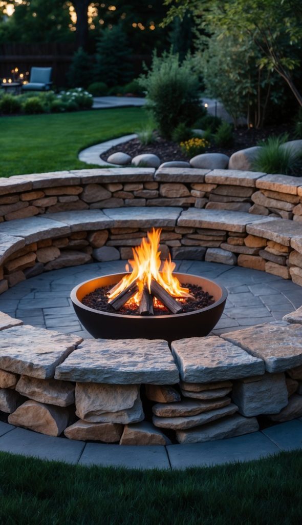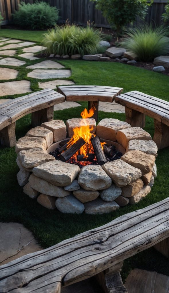 You can use stacked stones to build a seating wall around your firepit. This creates a cozy, rustic feel and gives guests a place to sit. The stone wall also helps define your fire area and adds a natural look to your backyard.