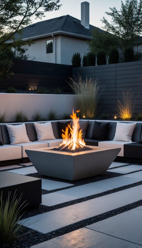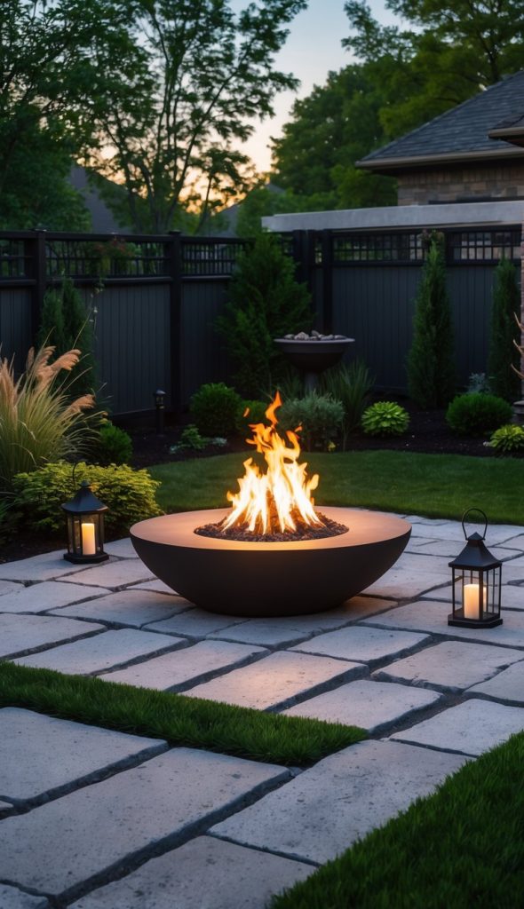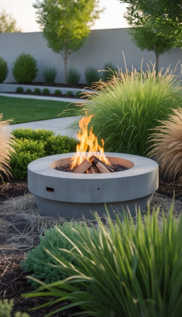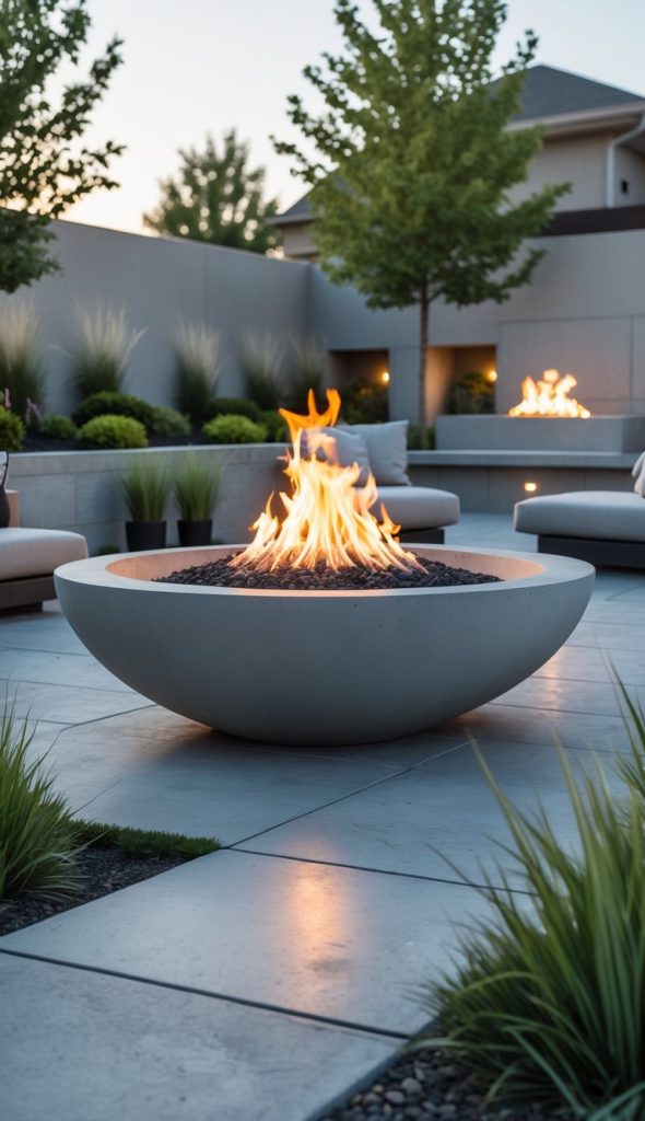 You can create a clean, modern look with a concrete fire bowl as your backyard centerpiece. It gives a sleek, simple style that fits many outdoor designs. Surround it with comfy seats or wooden chairs to make your space feel inviting.