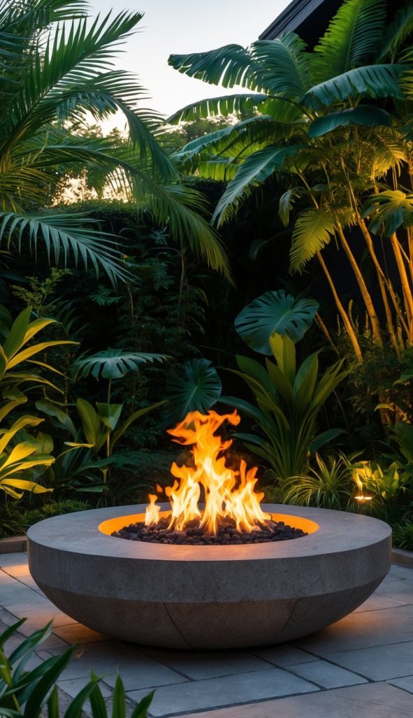 You can create a relaxing space with a circular fire pit surrounded by lush tropical plants. Use large green leaves and colorful flowers to make a natural backdrop. This setup adds a fresh, vibrant feel while keeping your fire pit as the main focus.