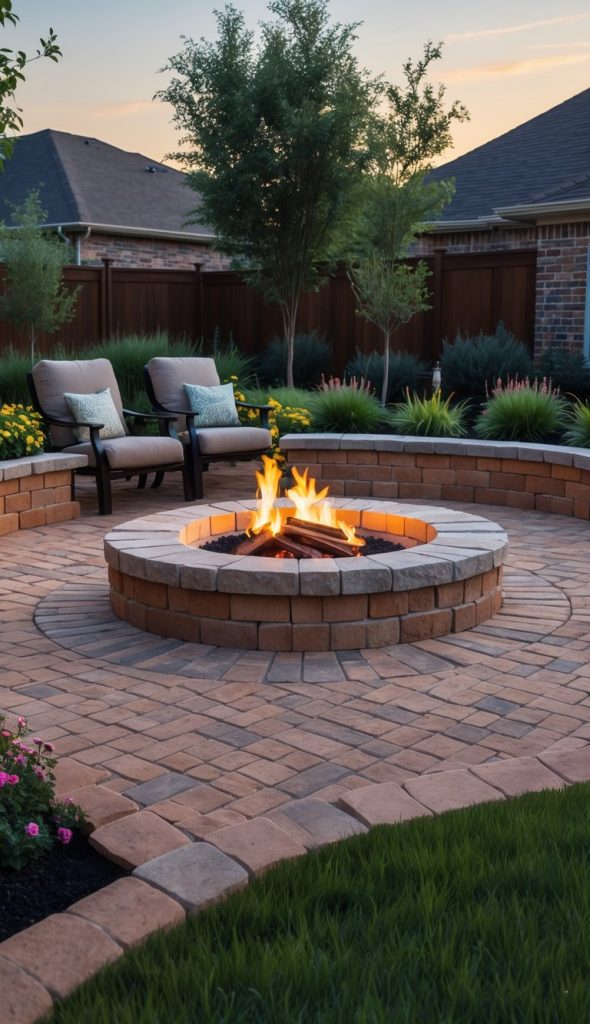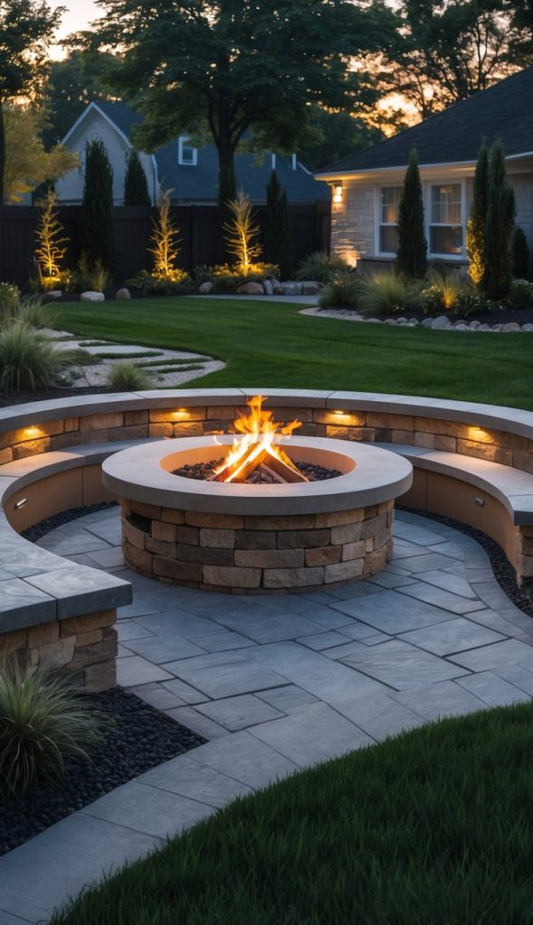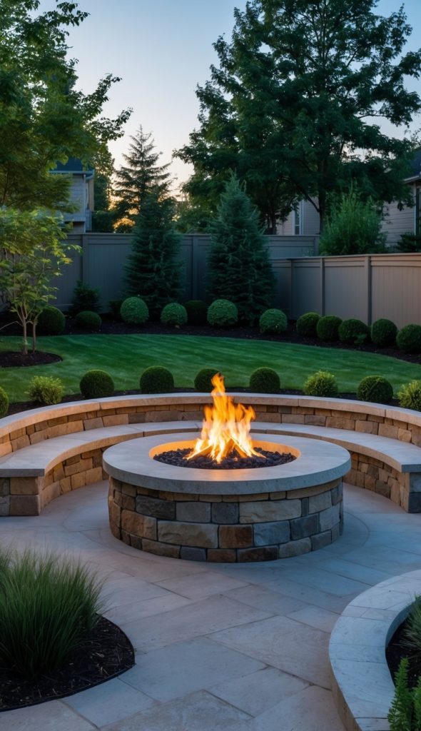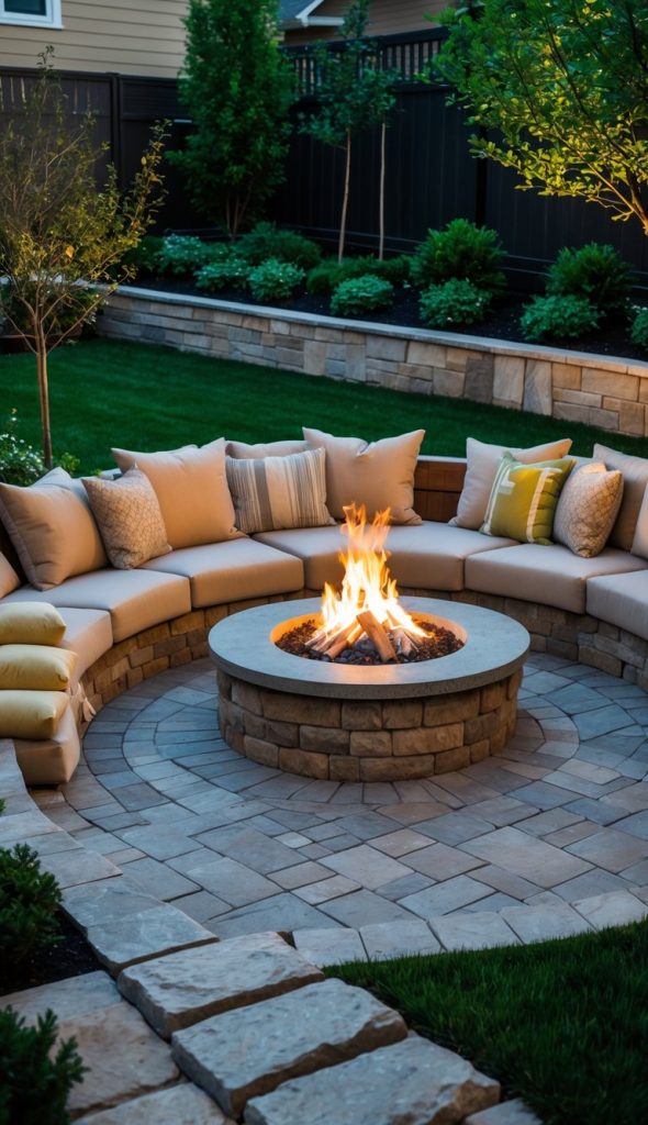 You can create a cozy spot by building a circular firepit with benches around it. The curved benches let everyone sit close and enjoy the fire together.